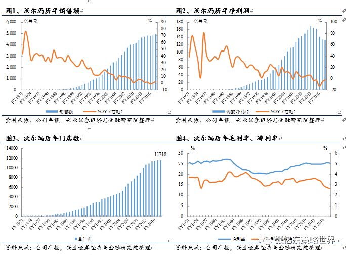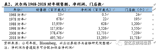 公司2018财年的销售额为4,958亿美元、净利润133亿美元,开店数11,718家,分别是1968财年的39,297倍、27,593倍、488倍。