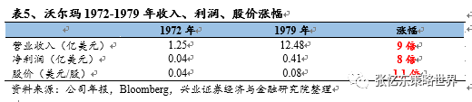 1).1972-1979年,沃尔玛小镇开店,成长为区域零售霸主,净利润增长了8倍,尽管净利润保持了高增长,CAGR为40%,但由于规模偏小,能否成为伟大公司还存在不确定性,沃尔玛股价仅上涨了1.1倍,并且出现大起大落。PE从56.8x下降至11.8x,有较大的风险折价。