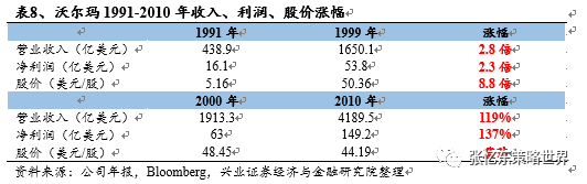 1991-1999年:沃尔玛保持中高速增长,营业收入增长了2.8倍,净利润增长了2.3倍,伴随着公司规模的扩张,沃尔玛股价增长了8.8倍。