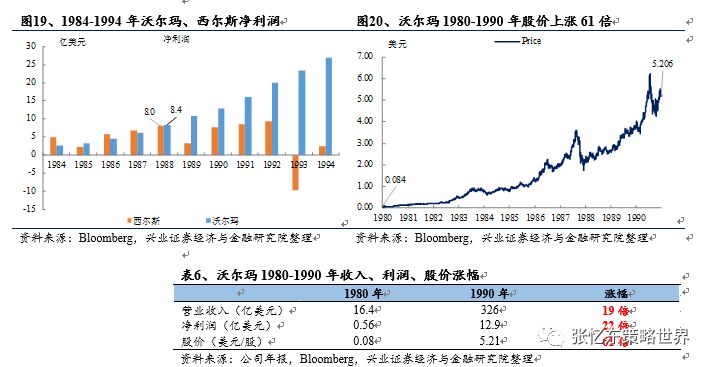 由于伟大公司的地位已经完全确立,市场给予了沃尔玛合理估值。1980-1990年,沃尔玛营业收入增长了19倍,净利润增长了22倍,随着沃尔玛规模的不断增长,发展壮大,得到了市场认可,给予沃尔玛合理估值,沃尔玛股价期间上涨61倍。