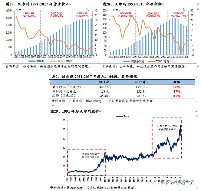 2011-2017年:受到电商的冲击,实际上沃尔玛销售额和业绩成长几乎停滞,营业收入CAGR为2%,净利润CAGR为-2%。2011年开始,沃尔玛将电商发展提升至全球化战略高度,对于电商、移动平台的投入效果获得了初期的成果,由此股价增长了117%。