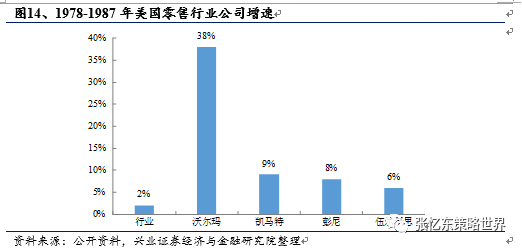 沃尔玛一枝独秀。20世纪80年代整个零售业销售增长率仅2%。而沃尔玛1978-1987年的10年间却保持了年销售收入增长38%的速度,与之对应的,凯玛特同期的销售增长率仅9%,彭尼为8%,伍尔沃思为6%,更别提几乎停滞不前的西尔斯了。沃尔玛实现真正的飞跃就是在20世纪80年代。