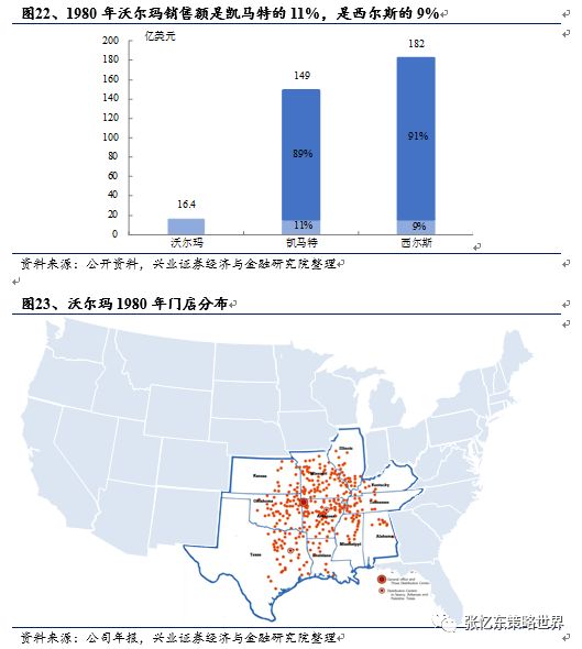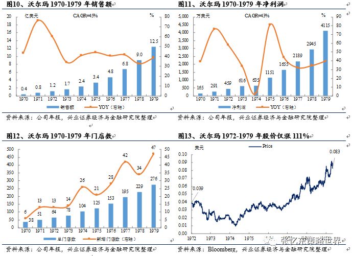 成为区域性零售公司霸主。1970-1979年的10年间,沃尔玛销售收入从4429万美元增至12.48亿美元,CAGR为45%;净利润从165万美元增至4115万美元,CAGR为43%;门店数从38家增至276家,增长了6倍,遍布11个州;总营业面积117万平方米,单店面积4208平米。沃尔玛一跃成为最年轻的年销售收入超10亿美元的零售公司。同时,在区域性零售公司中,它是成长最快的,也是唯一销售收入超过10亿美元的。