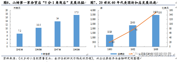 20世纪60年代,折扣店在美国进入快速发展期,对小镇的传统杂货店造成巨大威胁。作为之后超市业态的前身,低价进货、便宜卖出、以经营综合系列产品为特点的折扣店零售形式受到消费者广泛认可,它跟传统杂货店相比面积更广、收入规模也更大。1960年底全美折扣店1329家,到1962年底,数量已达2363家,到1966年底达到3503家。折扣店单店面积5000平米,年营业额近300万美元,而当时小镇杂货店单店面积只有200-300平米,年营业额10万-20万美元。