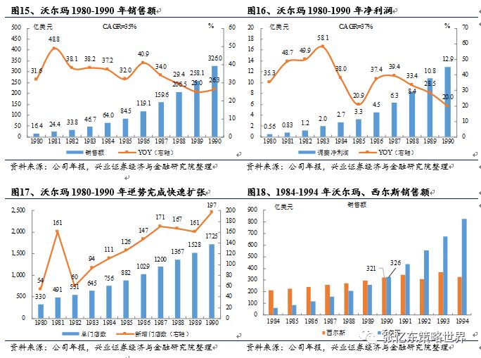 成为全美第一。1980-1990年,沃尔玛保持了持续高增长,营业收入从16.4亿美元增至326亿美元,CAGR为35%;净利润从0.56亿美元增至12.9亿美元,CAGR为37%;门店数从330家增至1725家,增长了4.2倍,遍布美国35个州。到1990年,沃尔玛销售额326亿美元终于超过了百年老店西尔斯的321亿美元,成为了全美第一大零售公司。