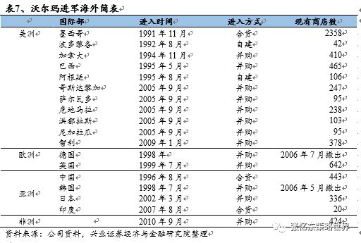 ——巴西、阿根廷:1995年5月,沃尔玛进入巴西。2004年收购了Bompreço公司的118家店;2005年又以7.64亿美元收购了Sonae公司在巴西的140多家店。2010年,沃尔玛成为了巴西零售业排行第三的超市。同年8月,沃尔玛通过自建商店方式进入阿根廷。
