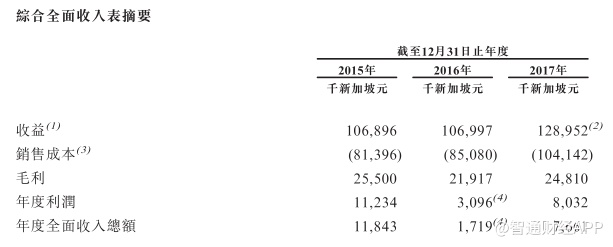 截至2017年12月31日止三年度,公司分别录得总收益约1.069亿新加坡元、1.07亿新加坡元及1.29亿新加坡元。截至2017年12月31日止三年度的除税后利润分别约为1120万新加坡元、310万新加坡元及800万新加坡元。