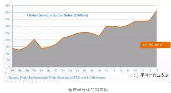 在过去20年里,世界半导体的销售额从1997年的1372亿美元,增加到去年的4122亿美元。年复合增长率达到了6.65%。而根据WSTS的最新预测,2018年,全球半导体的销售额将会达到4370亿美元,明年更将达到4530亿美元。