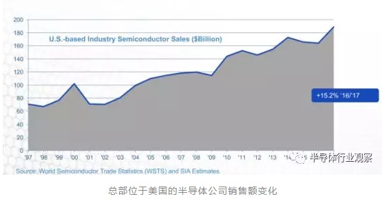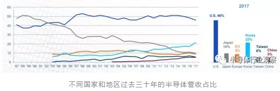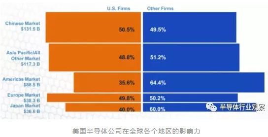 2017年,总部位于美国的半导体公司的销售额占了全球46%的市场,在很多主要的半导体消耗低,美国公司产品的占有率也都在50%左右徘徊。但在全球最大半导体市场之一的日本,美国的市场份额只有40%,不过这与日本一贯以来不怎么接受国外企业产品的历史有关。