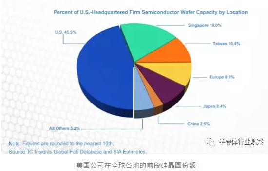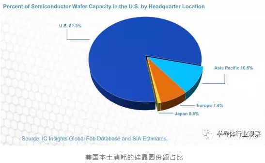 在2017年,81%美国本土的半导体硅晶圆是被美国半导体公司消耗。而总部位于亚太地区的公司,只消耗了美国总晶圆的10%。