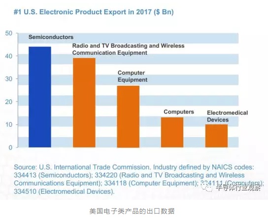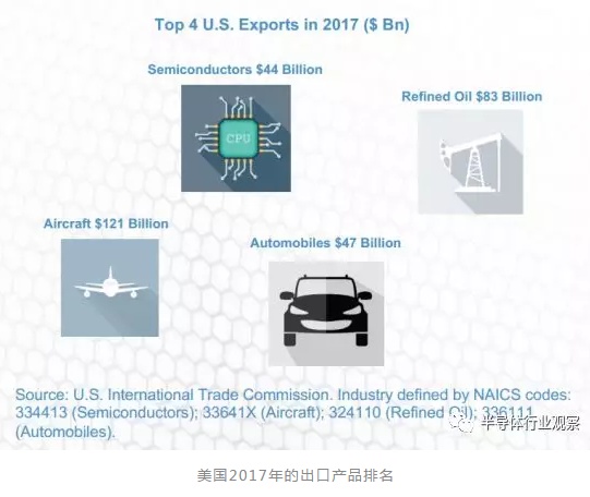 数据显示,2017年,美国的半导体出口总额达到440亿美元,位于美国出口产品第四的位置。排在前面的是飞机、成品油和汽车。半导体产品出口数据领先于美国的其他电子产品的出口。