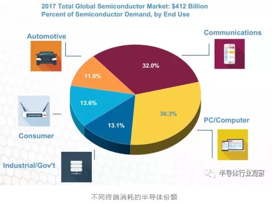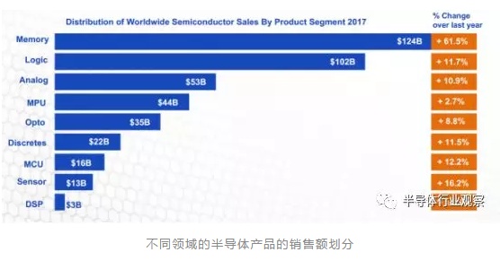 半导体产品是开发先进产品的必备元件。随着近年来市场的发展推动,半导体市场消耗量最多的产品逐渐被存储、逻辑器件、模拟和MPU等产品所占领,这四个产品类型在刚过去的2017年全球半导体销售额占比为78%。