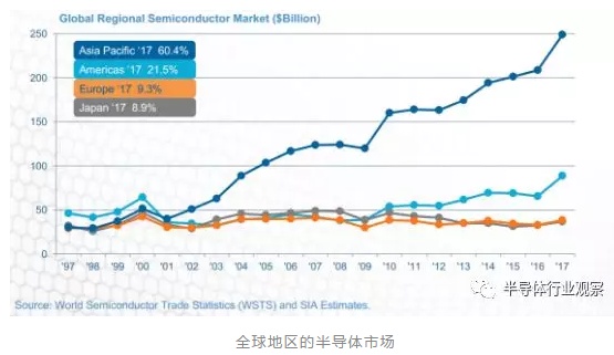 随着电子产品制造的转移影响,亚太地区在2001年超越了其他国家和地区,成为全球最大的半导体消耗地。自那以后,该地区的市场份额在快速增长。在2001年,该地区的电子消耗总额为398亿美元,但到了2017年。总额高达2490亿美元。而中国更是这个地区电子产品的绝对主导国。在2017年,他们在亚洲地区的占比为53%,而全球占比也高达32%。这些数据最后也都反应到了相关的半导体产品的销售上面。