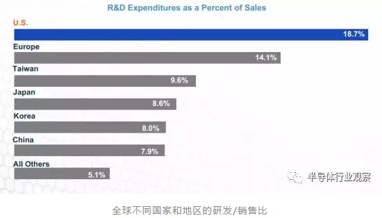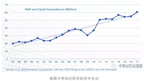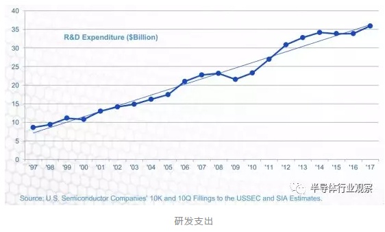从1997到2017年,美国半导体产业的研发支出过的年平均复合增长率接近7.4%,美国公司的研发支出一直也处在比较高的水平。忽略销售波动的影响,我们可以看到投入对半导体产业的影响。在刚过去的2017年,美国半导体企业的研发投入高达359亿美元。