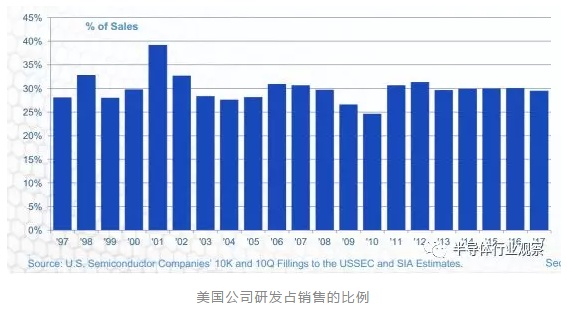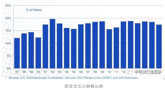 为了保持在产业中的竞争力,半导体公司必须将其营收的大部分投入到研发和设备上去。半导体产业的特殊性,也要求这些公司去推进更复杂的设计和制程技术。如果要追上全球领先的技术步伐,就要求厂商每年将其营收的30%投入到研发中去。即使在销售下滑的年份,这笔投资也不能减少。