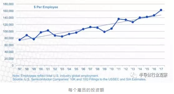 与1997年相比,现在美国半导体的劳动生产率有了不止一倍的增长。而这主要是通过资本和研发的投入来实现的。在2017年,美国半导体产业的人均销售总额达到了创历史新高的551000美金。