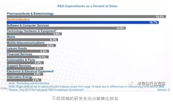 美国半导体工业研发支出位于高科技领域投入中比较领先的位置。根据2017年的研发投资数据显示,美国半导体产业的投入仅落后于药物和深刻领域。