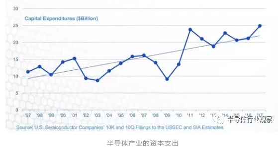 2017年,半导体产业的总资本支出达到历史新高的248亿美元,较之2016年的212亿美元,同比提升了17%。而在2001年到2003年,资本支出有了明显的下滑,这主要是因为晶圆厂所需要的主要设施更新在1999年到2001年已经完成了。到了2004年和2005年,整个半导体的资本支出又有了一个反弹。在2009年的暴跌之后,半导体支出重新站上了一个新高位。