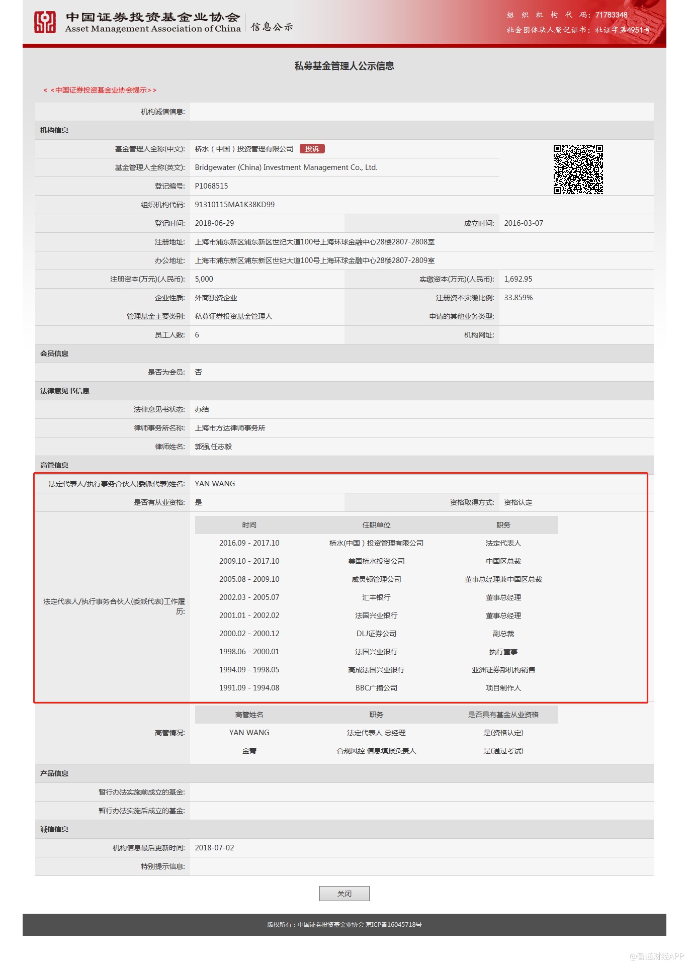 公司于2016年3月设立,2018年3月桥水(中国)将经营范围变为“投资管理”。法定代表人为王岩(音译)。根据私募基金管理人登记备案的相关规定,桥水基金境内私募产品应在最迟6个月后发行。