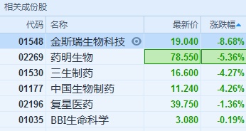 智通财经APP获悉,今日生物科技板块大幅下挫逾4%,截至15时34分,金斯瑞生物科技(01548)跌8.68%领跌,报价19.04港元;药明生物(02269)跌5.36%,报价78.55港元;三生制药(01530)跌4.27%,报价16.6港元。