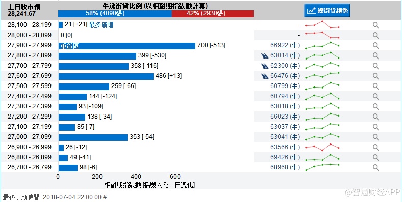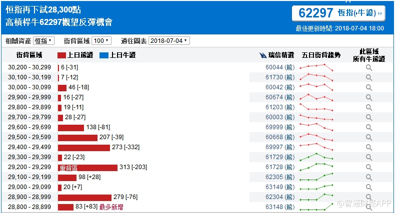 智通财经APP获悉,截至7月4日,恒指最新的牛熊街货比例为58:42。从瑞信恒指牛熊证街货分布图中得到的数据显示,熊证街货重货区在29200-29299区间,此区间最新的熊证数量为313张,比上一交易日减少203张;最多新增落在28800-28899区间,此区间最新的熊证数量为83张,比上一交易日增加83张。牛证中重货区在27900-27999区间,该区间最新牛证数量为700张,比上一交易日减少513张;最多新增在28100-28199区间,该区间最新牛证数量为21张,比上一交易日增加21张。