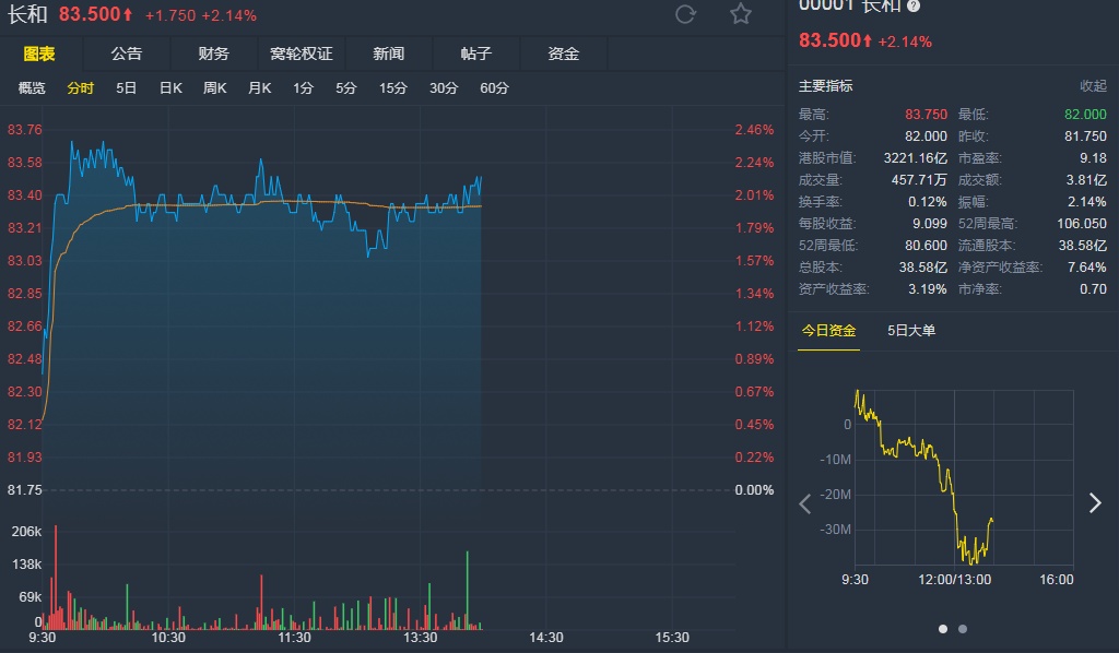 截至7月5日14:18,长和(00001)涨2.14%,报83.5港元。