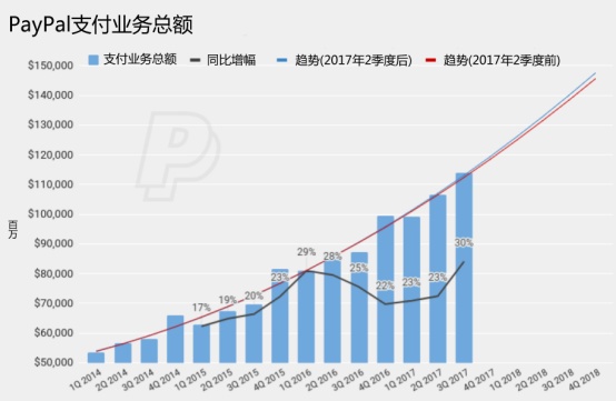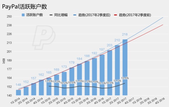 随后,准确抓住移动支付风口的PayPal就在这短短的两年内,从一个eBay的支付工具,一跃成为了美国移动支付龙头,活跃账户数保持着每季度10%的增幅,支付业务总额每个季度增幅也都能超过20%,并且在2017年有了加速增长的迹象: