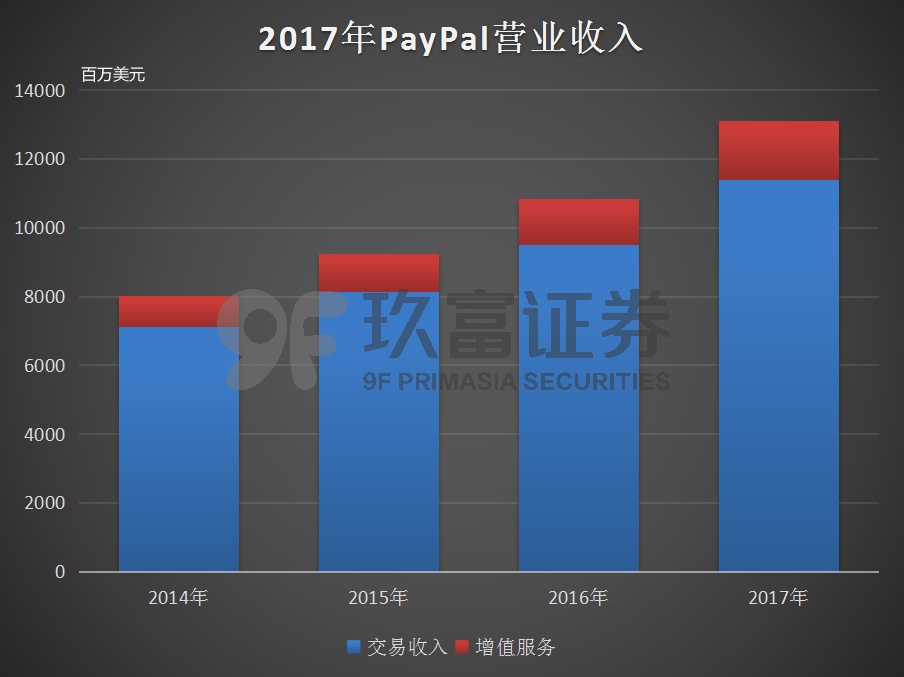 从PayPal三月份公布的年报来看,2017年公司依然保持着相对较高的增长速度,营业收入由2014年的80.25亿美元上升至130.94亿美元,涨幅达63.16%: