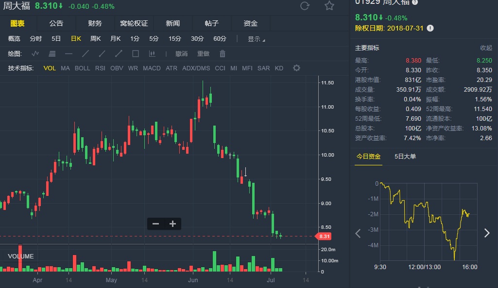 截至7月5日15:35,周大福跌0.48%,报8.31港元。