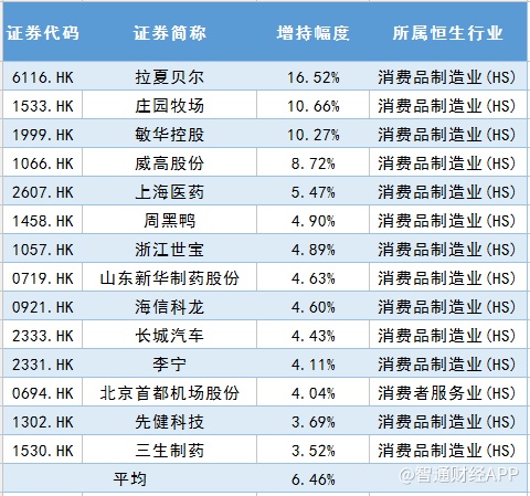 如细看上半年持股增幅前40个股,数量占比最多的也是恒生消费品制造业(包括消费品行业和医疗保健行业),达到35%,14只个股平均持股增幅为6.46%。数量第二多的是工业行业个股,有8只个股,平均持股增幅为5.84%。