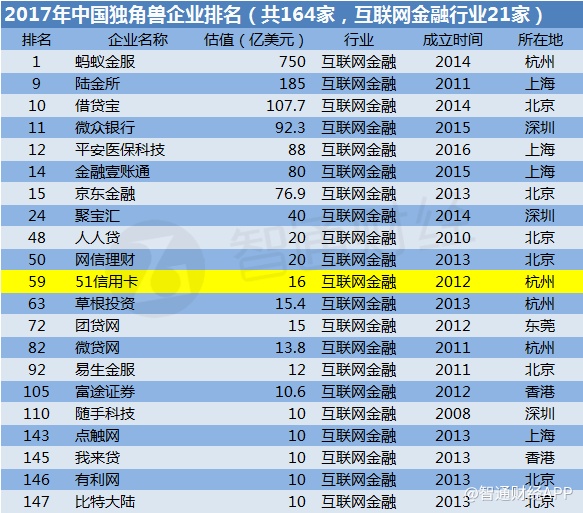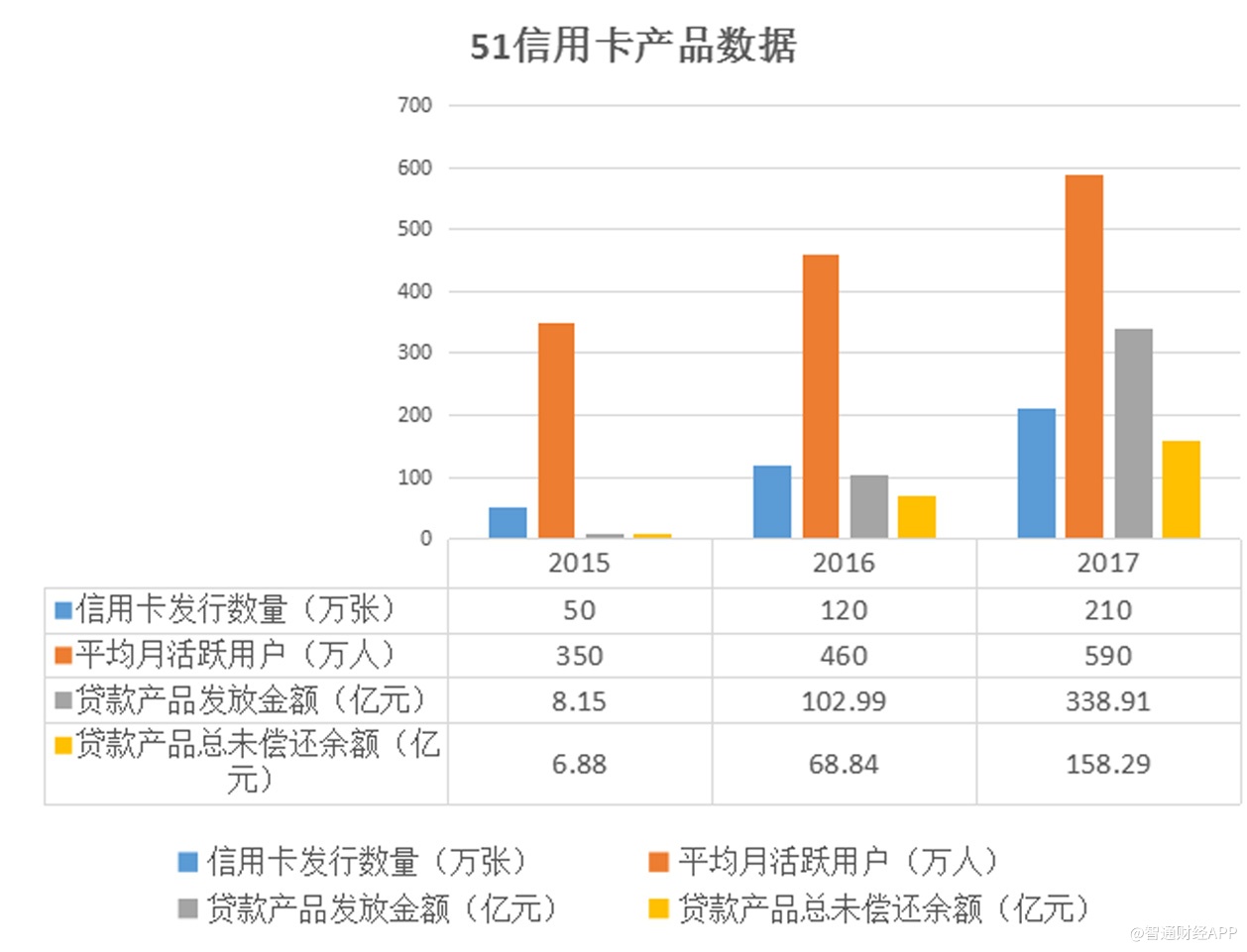 51信用卡则是中国最大的线上信用卡管理平台,2017年底管理约1.063亿张信用卡,促成信用卡还款交易总计1085亿元人民币。按发出的信用卡数目计,51信用卡同时也是国内最大的线上信用卡申请平台,2015-2017年发出的新信用数目分别为50万、120万及210万张。同时,51信用卡也入选了科技部公布的“2017年中国独角兽企业”名单。