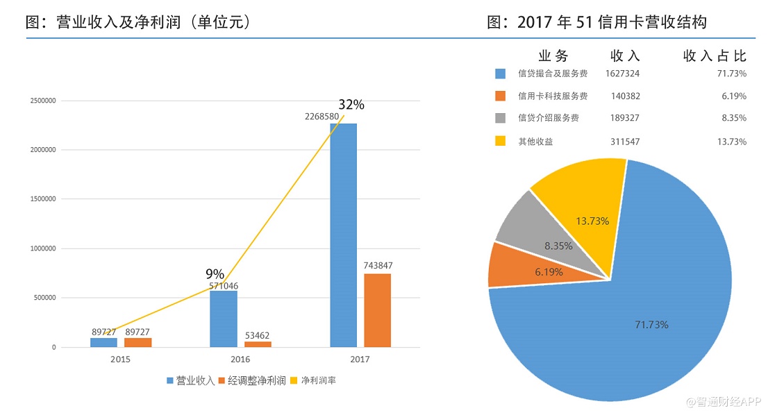2015-2017年,51信用卡的年营收复合增长率达到402.9%,经调整净利润分别约为-1.01亿元、0.53亿元、7.44亿元,已实现两年连续盈利。