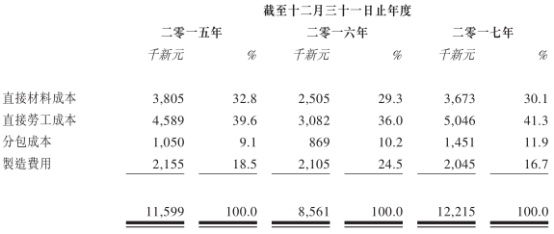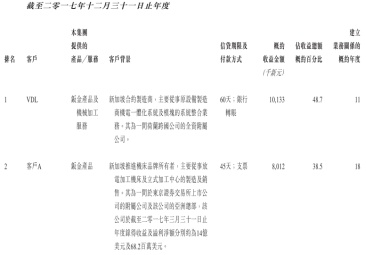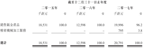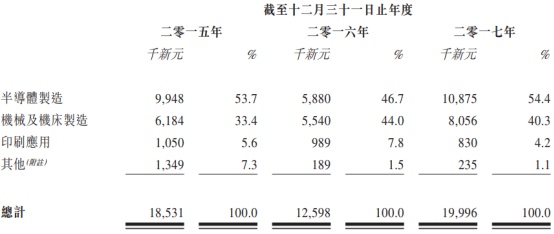 公司销售钣金产品业务于2017年录得营收近1.15亿港元(单位下同),占到全营收比重的96.2%,主要方向是半导体制造和机械及机床制造;剩下的3.8%是2017年才开始提供的精密机械加工服务,录得457万元收入。