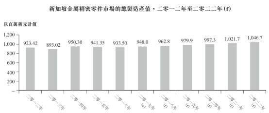而对于金属精密零件市场来说,2017年其市场价值达到9.48亿新元,自2012年起的复合年增长率约仅为0.53%,预计2022年底市场规模将达到约10亿新元,自2018年起至复合年增长率约为2.11%。