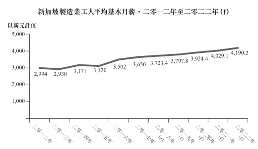 首先就新加坡而言,制造行业当地工人月基本工资由2012年2994新元,上涨至2017年3650新元,复合年增长率约4.04%。2018年后,新加坡正在努力减少对外籍工人的依赖性,当地技术工人需求预期将维持高水平,所以即使按照机构乐观预计,平均基本月薪仍将以3.00%的复合年增长速度,由2018年3723新元的月基本工资增至2022年的月4190新元。