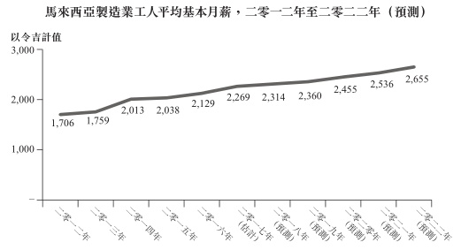 而马来西亚的增速就更加快了,当地制造业工人的基本月薪由2012年的月1706令吉,增至2017年的月2269令吉,复合年增长率约为5.87%。机构预测,2018年后仍会以3.50%的复合年增长率,由2018年月2314令吉增至2022年月约2655令吉。