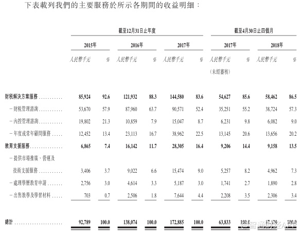 根据招股书显示,上海元哲报告称,就财税解决方案服务而言,理臣中国于2017年在内地同类服务提供者中位居首位(按收益计)。截至2017年12月31日止三个年度以及截至2018年4月30日止四个月,理臣中国的财税解决方案服务所贡献收益分别约占总收益的92.6%、88.3%、83.6%及86.5%,其中分别约65.5%、60.9%、56.4%及60.0%的收益来自华东地区。教育志愿服务所贡献收益分别约占总收益約7.4%、11.7%、16.4%及13.5%。