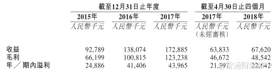 财务方面,截至2015年、2016年及2017年12月31日止年度以及截至2018年4月30日止四個月的收益分别为9280万人民币(单位下同)、1.38亿、1.72亿及6760万;纯利2490万元、4140万元、4400万以及2260万元。