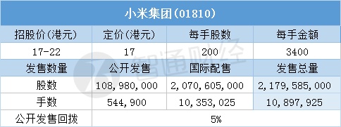智通财经APP获悉,7月6日,小米集团(01810)配售结束。本次配售招股价区间为17-22港元,最终定价17港元,每手3400港元。