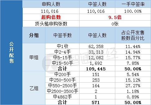 其中,公开配售申购人数110016,一手中签率100%,超购倍数9.5倍。