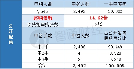 其中,公开配售申购人数7545,一手中签率30%,超购倍数14.62倍。