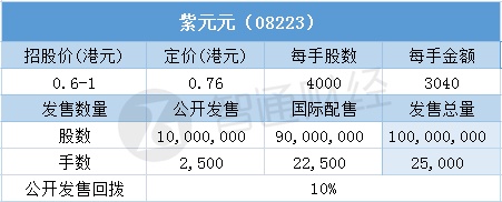 智通财经APP获悉,7月6日,向中国印刷及物流行业中小企业客户提供以设备为基础的融资租赁服务商紫元元(08223)配售结束。本次配售招股价区间为0.6-1港元,最终定价0.76港元,每手3040港元。