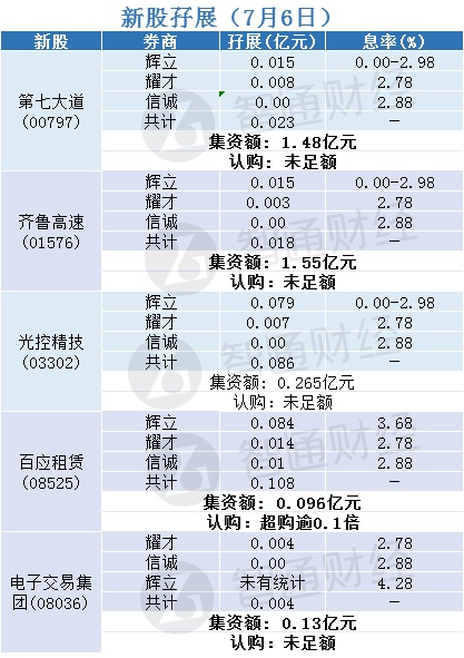 截至7月6日,正在招股的新股中,耀才、信诚、辉立3家券商为融资租赁公司百应租赁(08525)借出孖展金0.108亿港元,超购逾0.1倍。其他个股认购尚未足额。具体情况如下,下述5只个股下周一将继续招股。