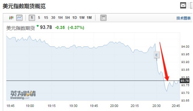 美元指数迅速跳水。截至发稿,报93.78,跌0.35或0.37%。