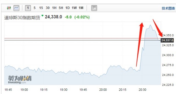非农数据和时薪数据先后公布,美指期货先短线上涨后迅速下跌,截至发稿,报24338.0,跌5.0或0.02%。