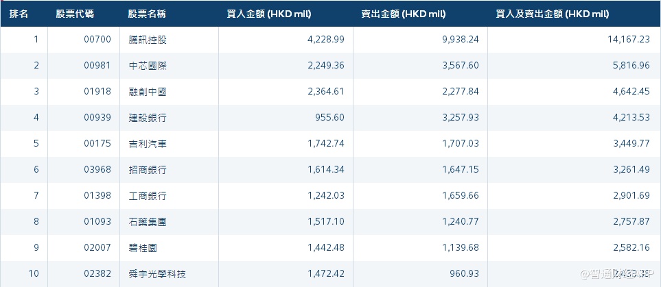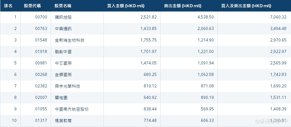 综合来看,港股通资金成交最为活跃的三只股票分别为腾讯、中芯国际(00981)和融创中国(01918),其总成交量分别为212亿港元、83.7亿港元和75.6亿港元。