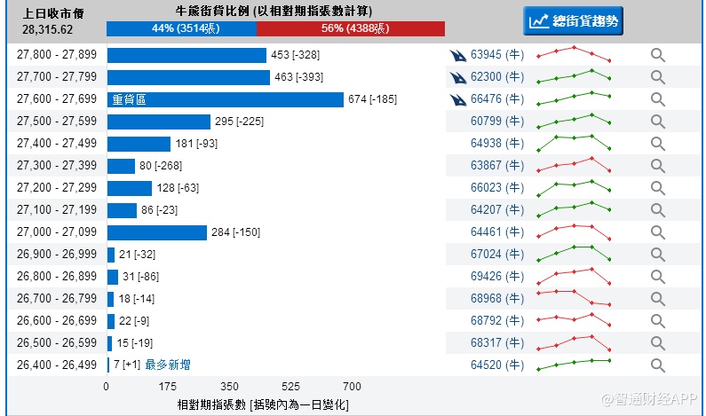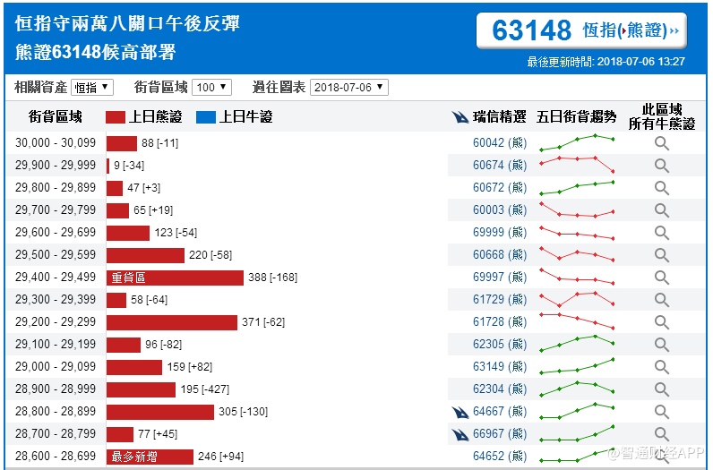 智通财经APP获悉,截至7月6日,恒指最新的牛熊街货比例为44:56。从瑞信恒指牛熊证街货分布图中得到的数据显示,熊证街货重货区在29400-29499区间,此区间最新的熊证数量为388张,比上一交易日减少168张;最多新增落在28600-28699区间,此区间最新的熊证数量为246张,比上一交易日增加94张。牛证中重货区在27600-27699区间,该区间最新牛证数量为674张,比上一交易日增加185张;最多新增在26400-26499区间,该区间最新牛证数量为7张,比上一交易日增加1张。