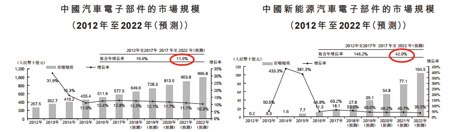 作为领先的汽车电子解决方案服务商,英恒科技将持续受益于行业的增长。2017年-2022年,中国汽车电子部件的市场规模年复合增长率为11.5%,中国新能源汽车电子部件市场规模将以42%的年复合增长率发展。