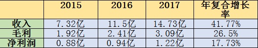 在行业快速发展的带动下,英恒科技也取得了不错成绩。2015年时,该公司收入为7.32亿,2017年时收入便翻了个倍至14.73亿元,年复合增长率41.77%。