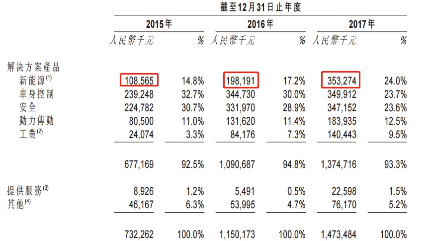 收入的高速增长,主要得益于各产品收入的提升,这其中又以新能源解决方案增长最快,三年复合增长率80%,其收入占比由2015年的14.8%提升至2017年的24%,其余各产品收入均逐年增长。